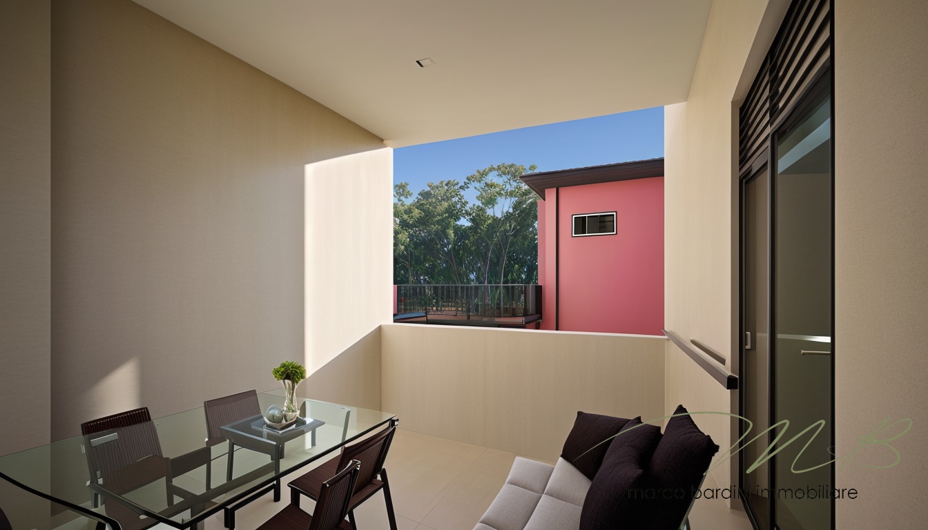 Il soggiorno, spazioso e accogliente, è arricchito da una loggia coperta, ideale per momenti di relax all’aperto.